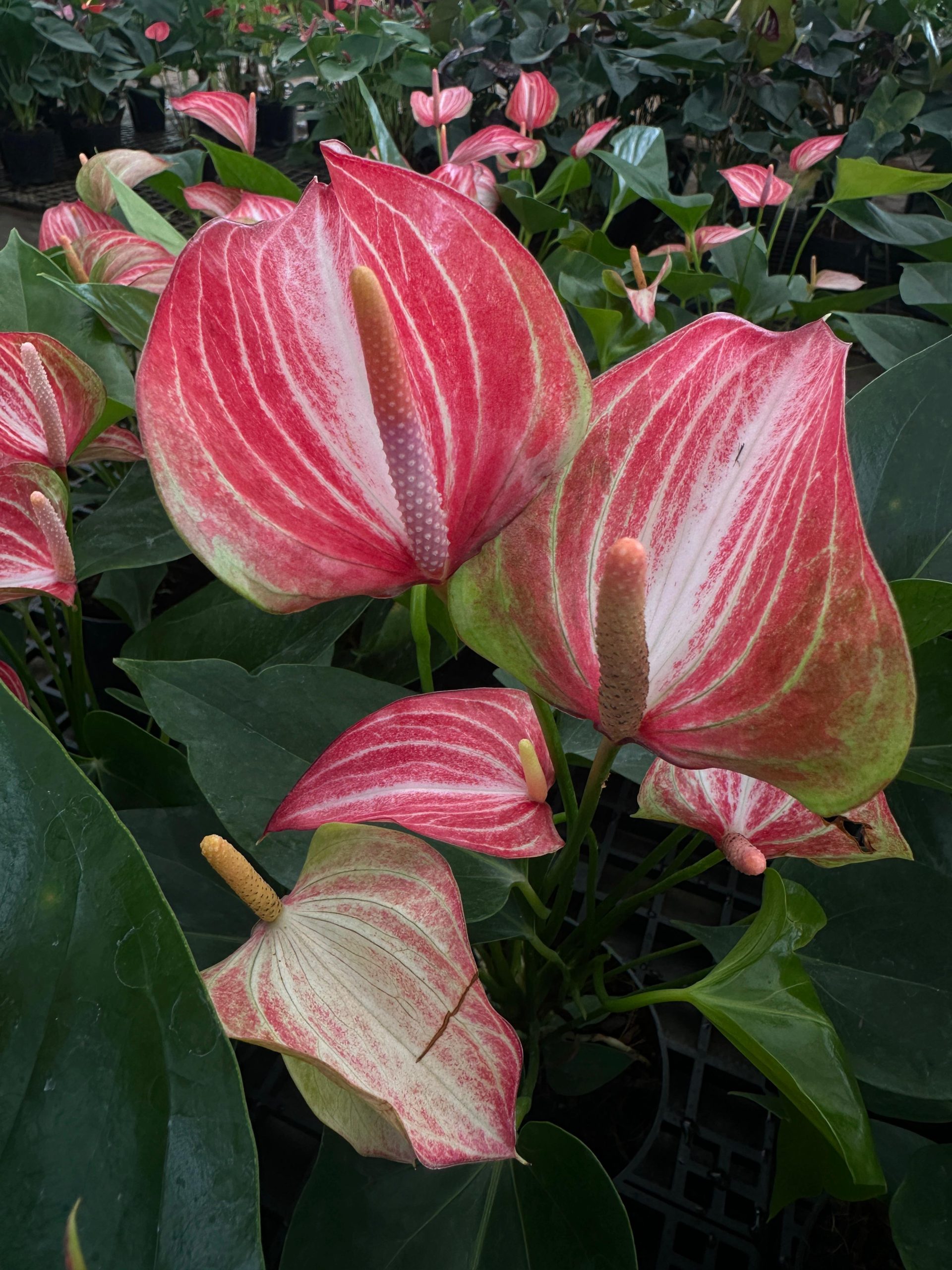 The Anthurium ‘Livium’ is a striking and elegant cultivar of the Flamingo Flower, Anthurium andraeanum. This tropical plant is celebrated for its vibrant, glossy, heart-shaped spathes—a modified leaf that is often mistaken for a flower—that can be a brilliant red or a unique striped pattern of pink and white. These long-lasting spathes, which can bloom year-round with proper care, create a beautiful contrast with its lush, dark green foliage, making it a popular choice for adding a pop of color and a touch of the exotic to indoor spaces.