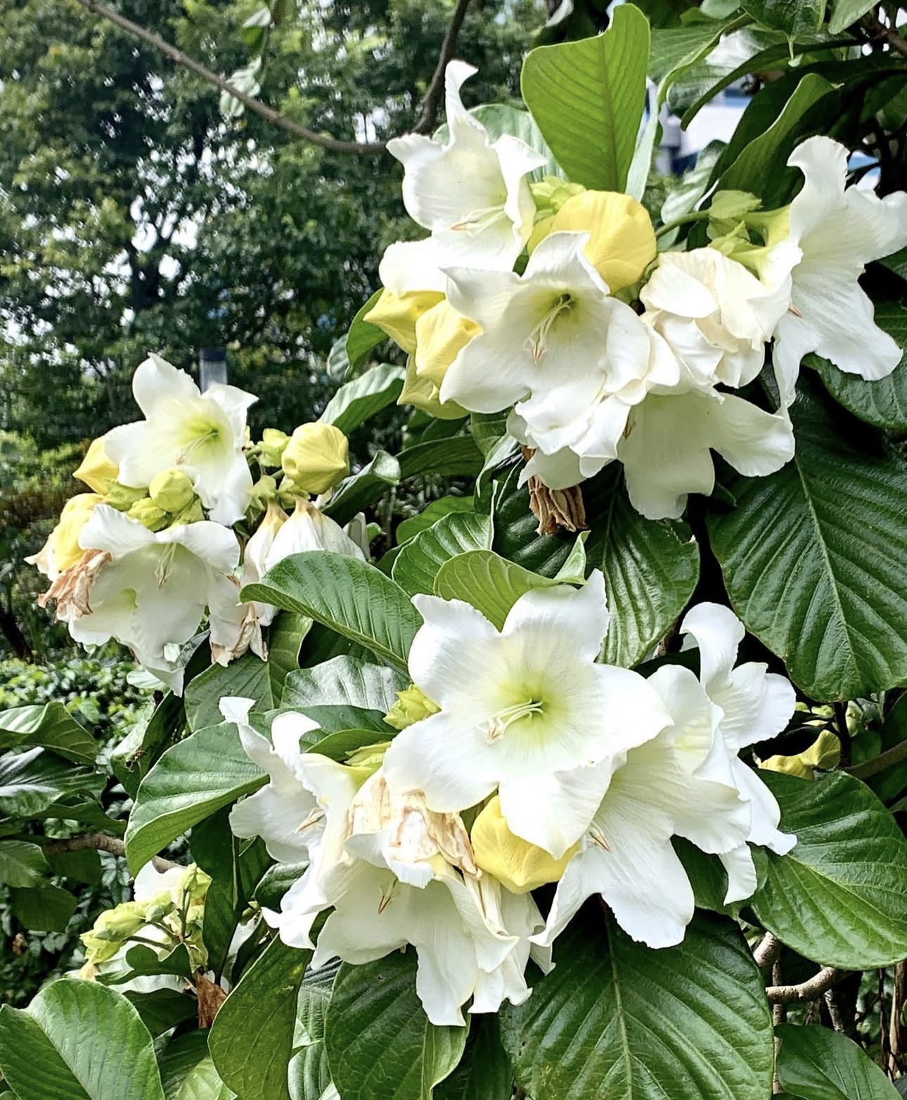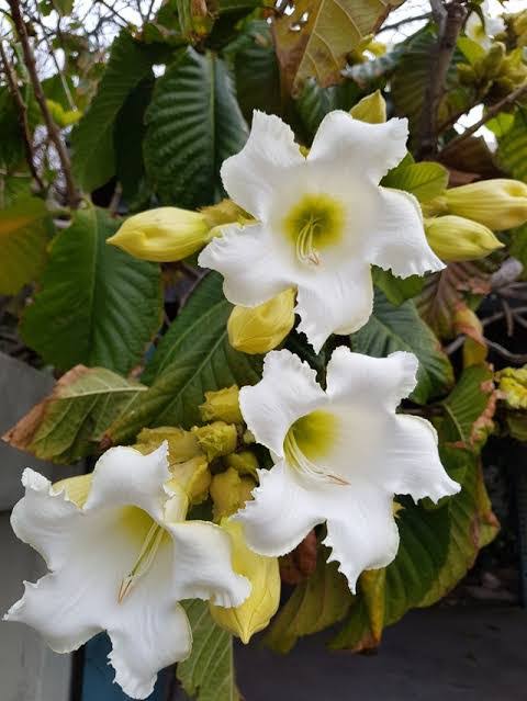 Its beauty begins with its magnificent, trumpet-shaped flowers, large and luminous, glowing in soft shades of creamy white. Each bloom feels sculpted by nature itself, with gently flared petals and a golden throat that seems to hold sunlight. When in full bloom, the flowers appear like hanging chandeliers, transforming walls, arches, and pergolas into living works of art.