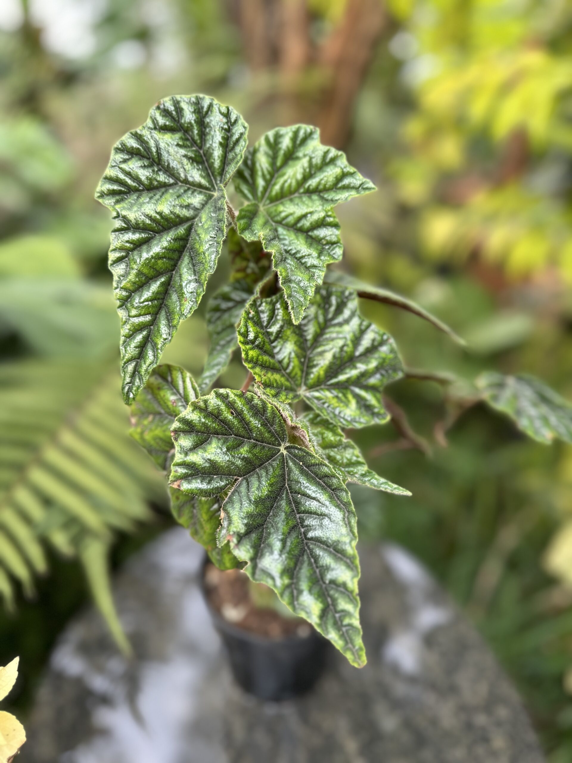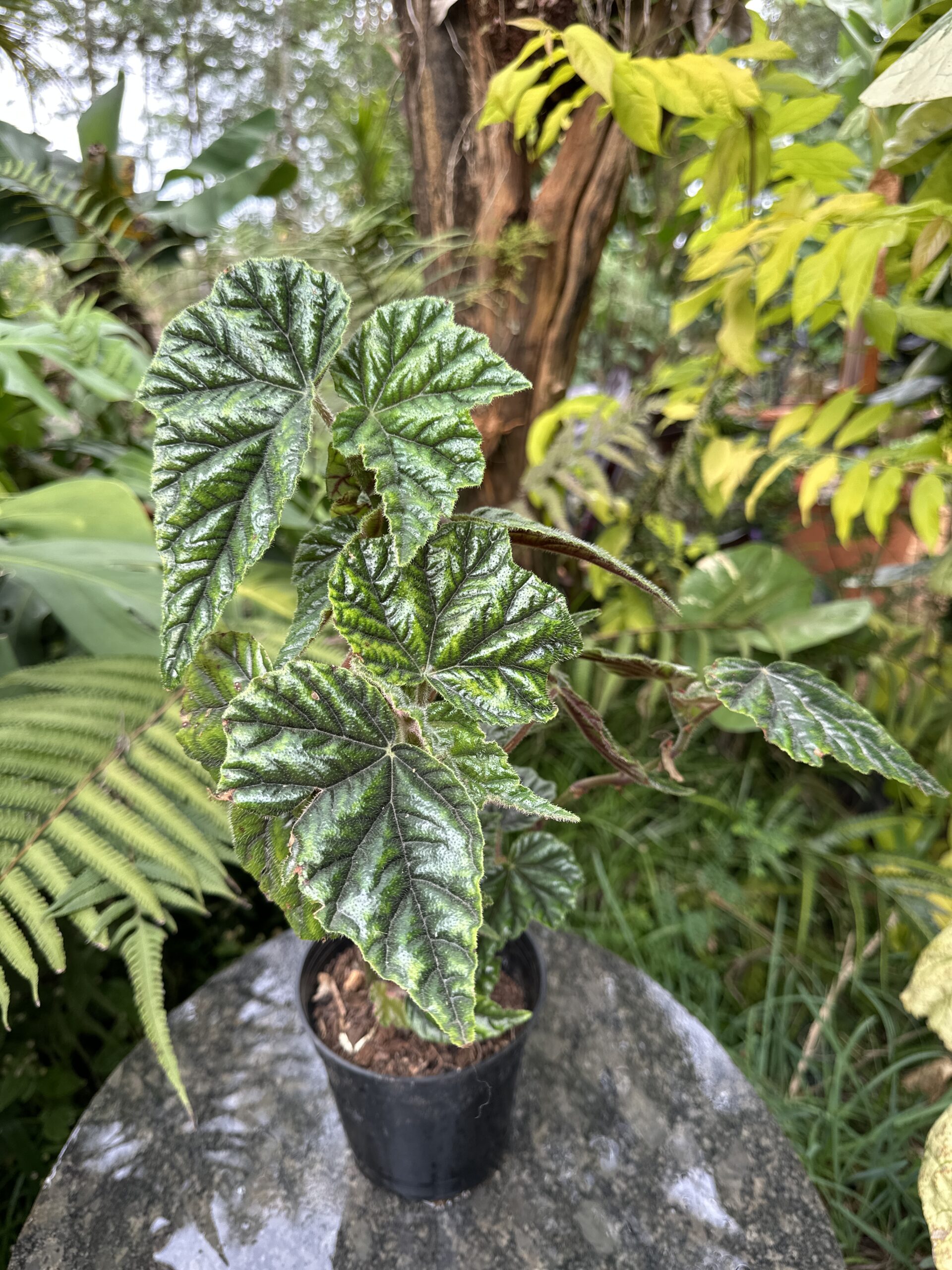 No Begonia metallica, also known as Metal-Leaf Begonia, is an easy-to-grow, upright, shrubby houseplant prized for its striking, textured leaves that have a silvery, iridescent sheen with dark veins, often compared to embossed silk, and red undersides