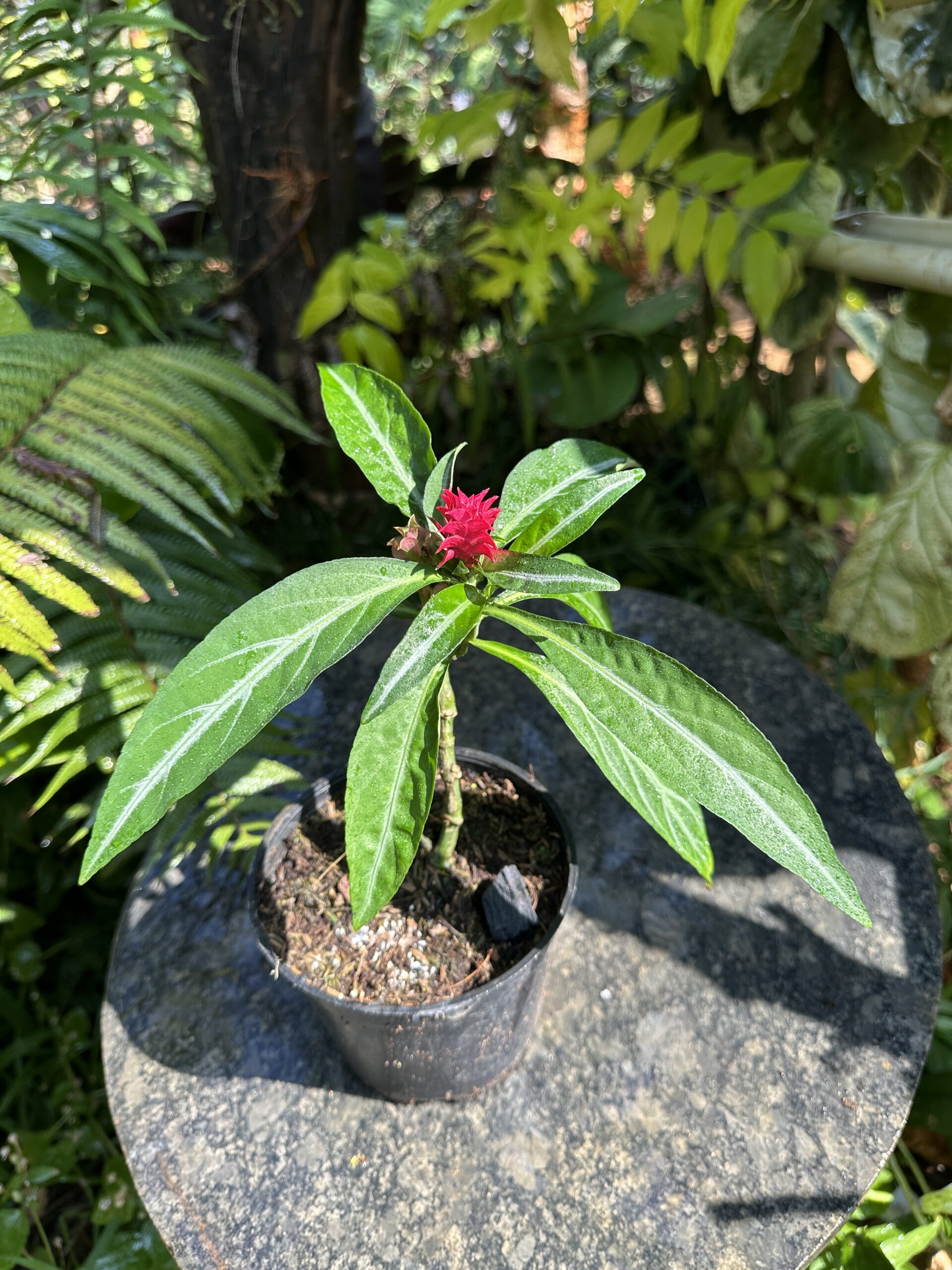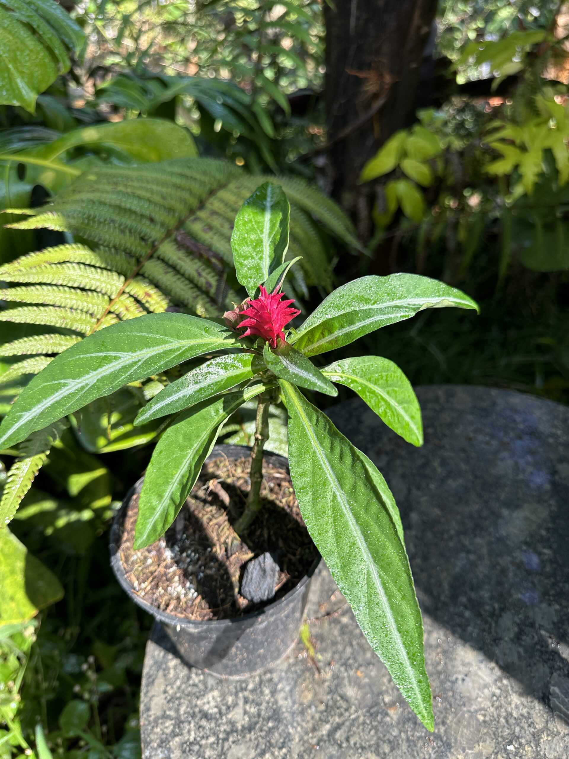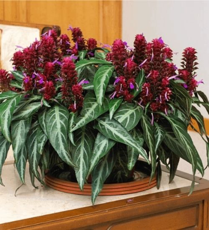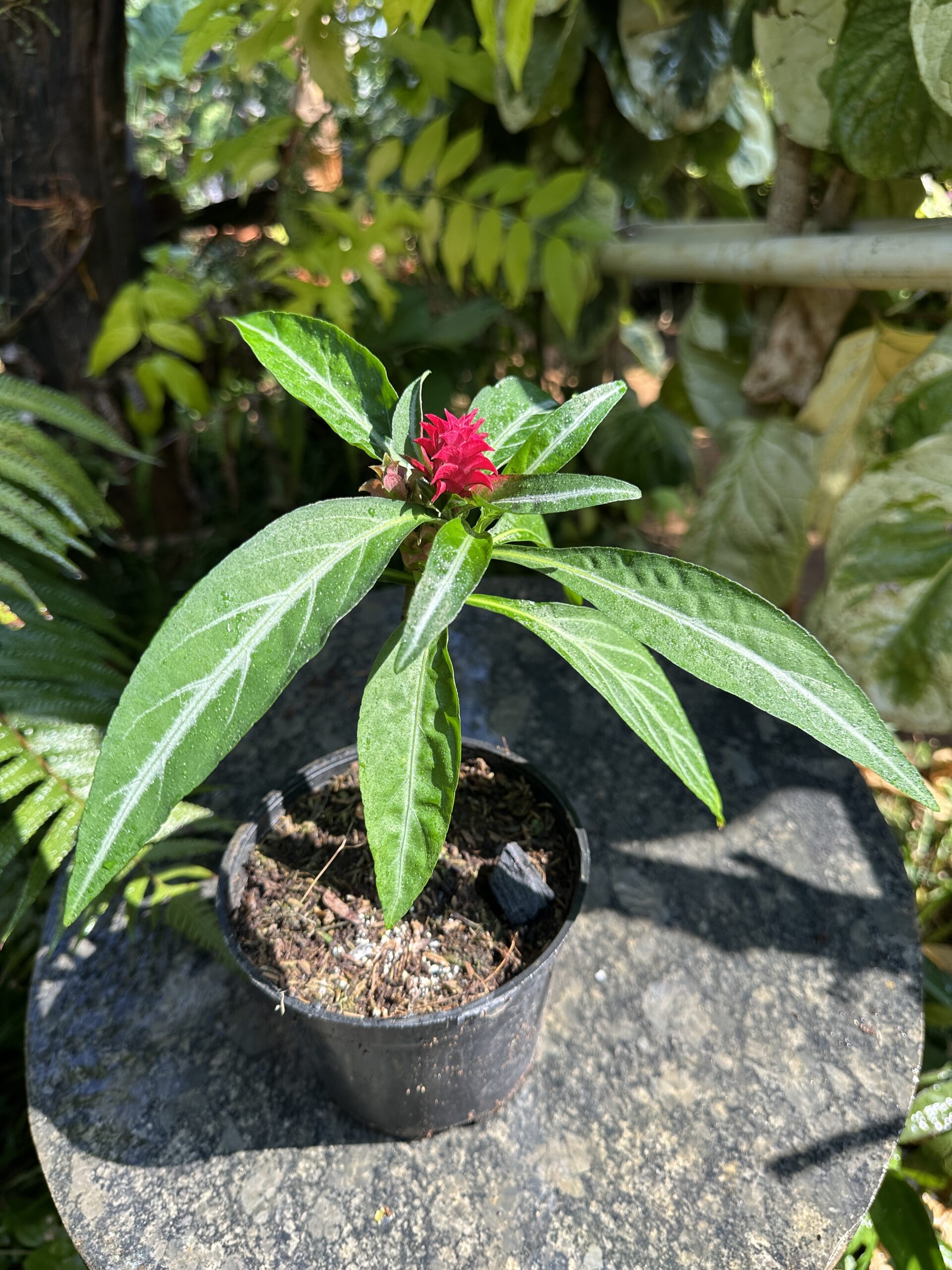 The Brazilian Fireworks plant (botanical name: Porphyrocoma pohliana) is a stunning tropical flowering plant known for its vibrant purple cone-shaped bracts with bright red tubular flowers that pop out like fireworks .