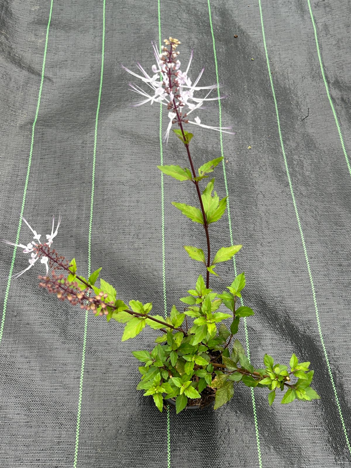 Orthosiphon aristatus, commonly known as Cat’s Whiskers or Java Tea, is a perennial herb belonging to the mint family (Lamiaceae). Native to Southeast Asia and parts of Australia, this plant is easily identified by its distinctive flowers, which feature long, protruding stamens that resemble a cat’s whiskers. The plant typically grows as a subshrub, reaching up to a meter in height, with a bushy appearance. It has dark green leaves with serrated margins and square, purplish stems. The flowers are arranged in a spike-like inflorescence and can be white, pale lilac, or purplish, adding to its ornamental value.