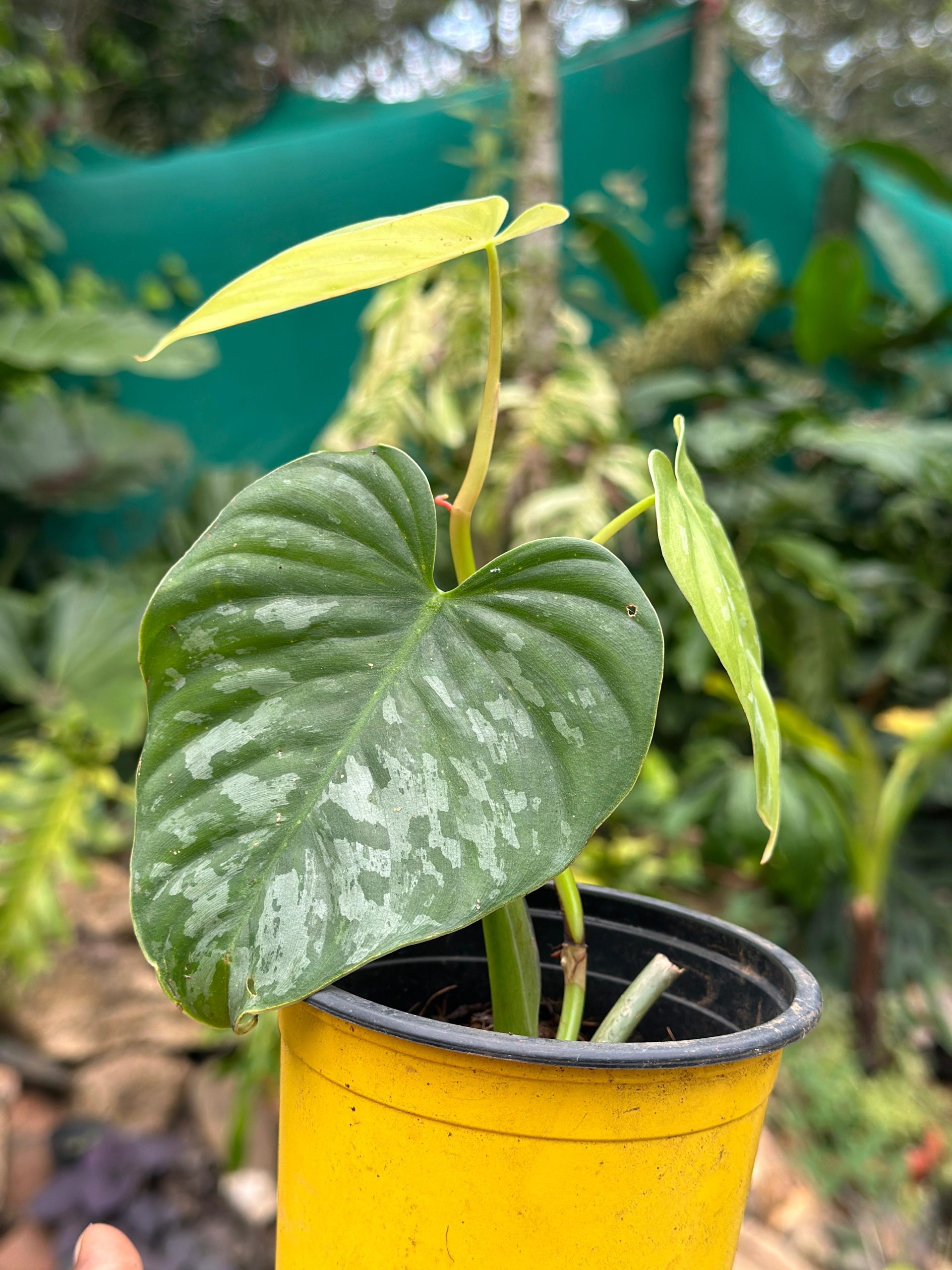 The leaves of Philodendron brandtianum wild form are its main attraction. They are heart-shaped and have a unique silver-green coloration, with prominent silver veins running through the foliage. This striking foliage makes it a popular choice among houseplant enthusiasts.